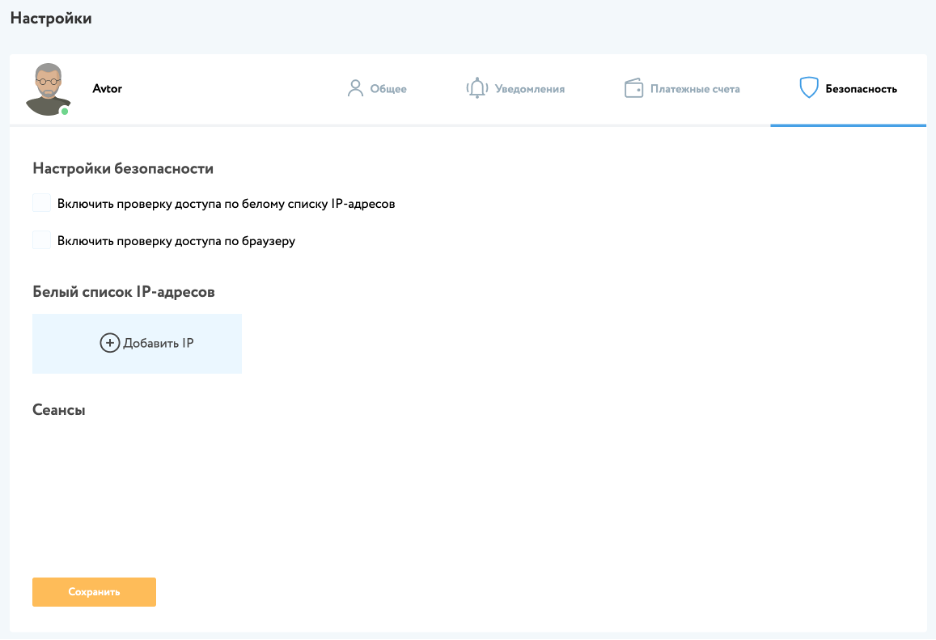 В следующем разделе «Безопасность» пользователь может настроить параметры безопасности работы своего аккаунта.