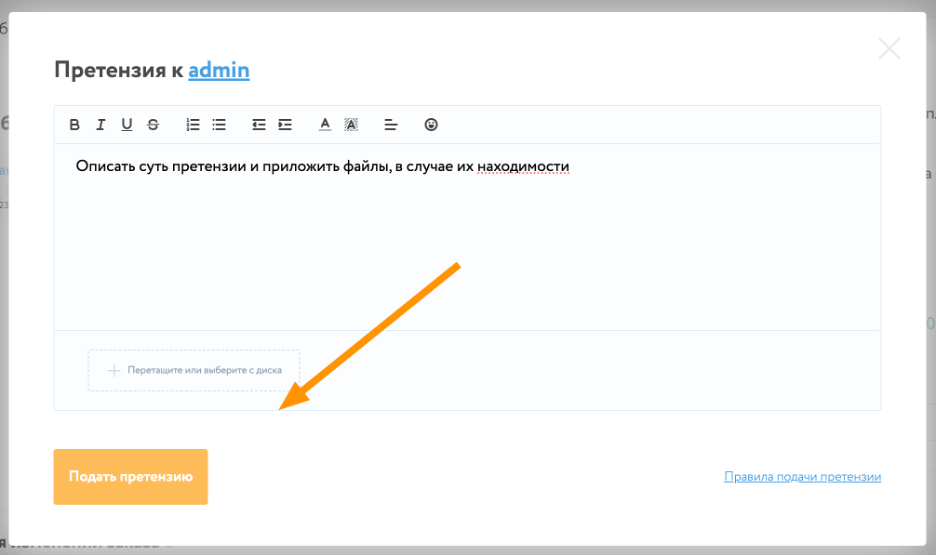 После нажатия на указанную функцию отроется форма подачи претензии. Пользователю, подающему претензию следует наиболее четко и детально описать суть претензии и отправить ее на рассмотрение администрации сервиса.