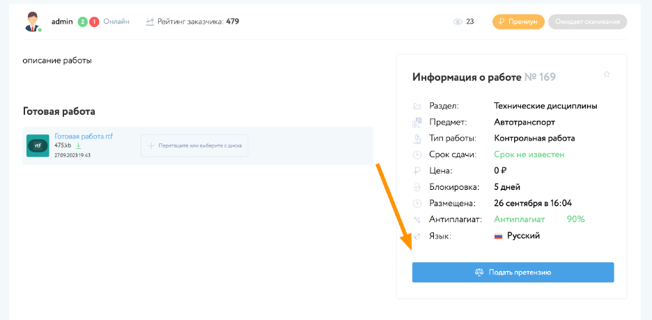Если заказ выполнен некачественно, то Заказчик имеет право подать претензию на Исполнителя, на странице заказа имеется кнопка «Подать претензию».