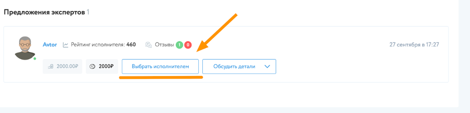 Если заказчика устраивает стоимость, которую указал специалист, то в таком случае он осуществляет выбор специалиста нажимая на кнопку «Выбрать специалиста»