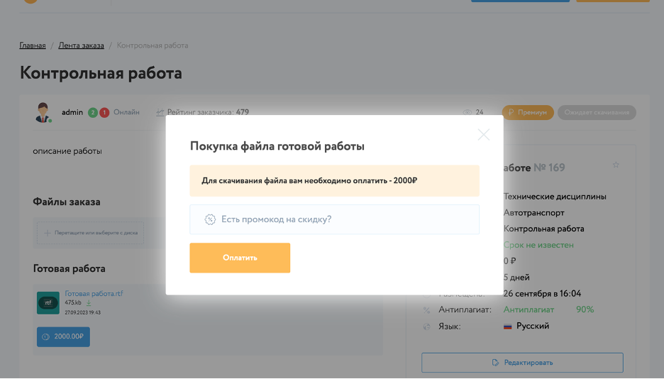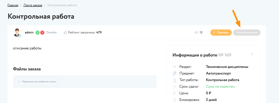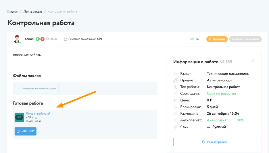 Специалист загружает файл готовой работы на страницу заказа. После того, как заказ выполнен и опубликован, информация о готовности заказа, будет видна заказчику на странице заказа.