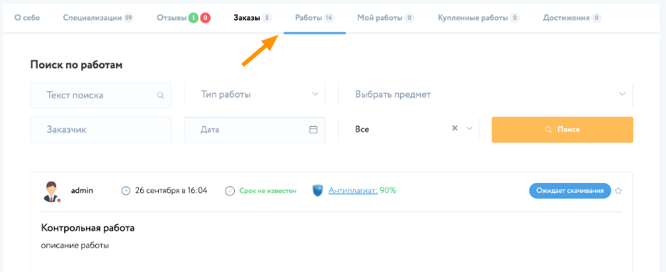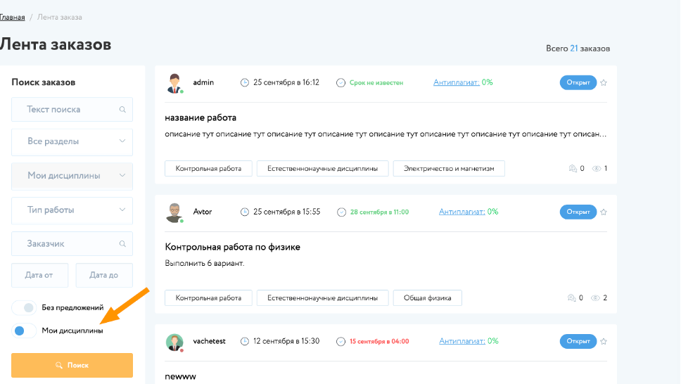 Поисковая системы страницы «Лента заказов» выдаст те заказы, которые соответствуют специализации пользователя, определенные при их настройке на «Странице пользователя».
