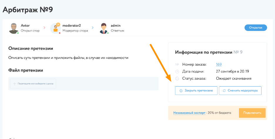Сторона, открывшая претензию в случае достижения договоренности может в любой момент закрыть претензию, за исключением случая когда к претензии был привлечен независимый эксперт.