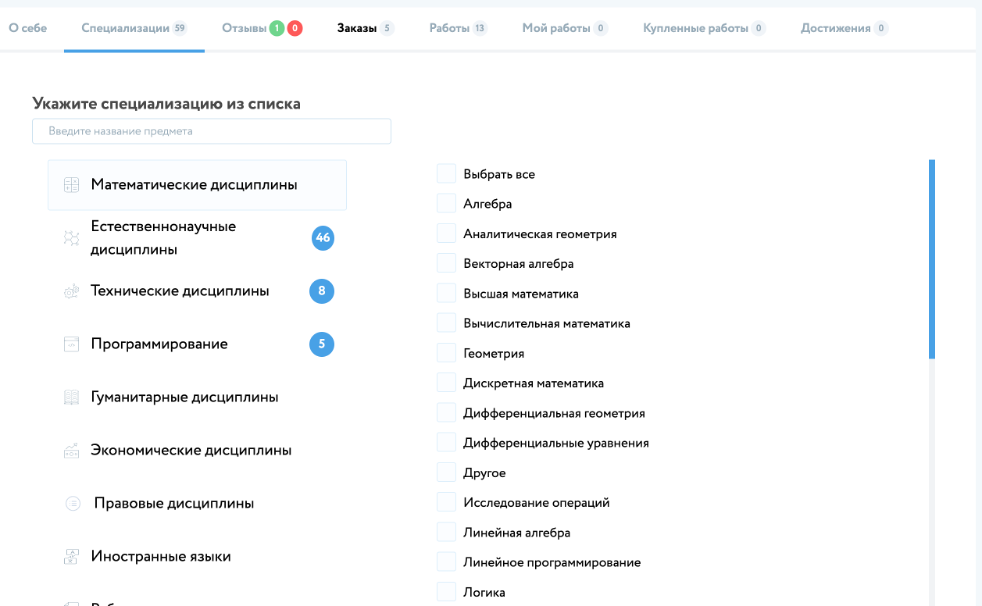 Для упрощения поиска, пользователь (специалист), который хочет выбрать заказы, должен определить специализации, по которым он может выполнять работы.