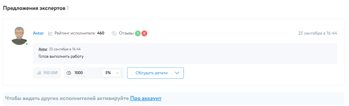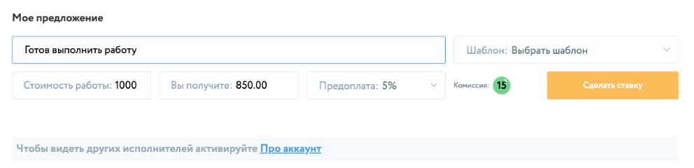 После этого, пользователь переходит на страницу заказа и делает ставку (сумму, в рамках которой он готов выполнить работу).