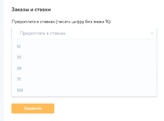 В разделе «Заказы и ставки» пользователь может установить автоматический процент предоплаты