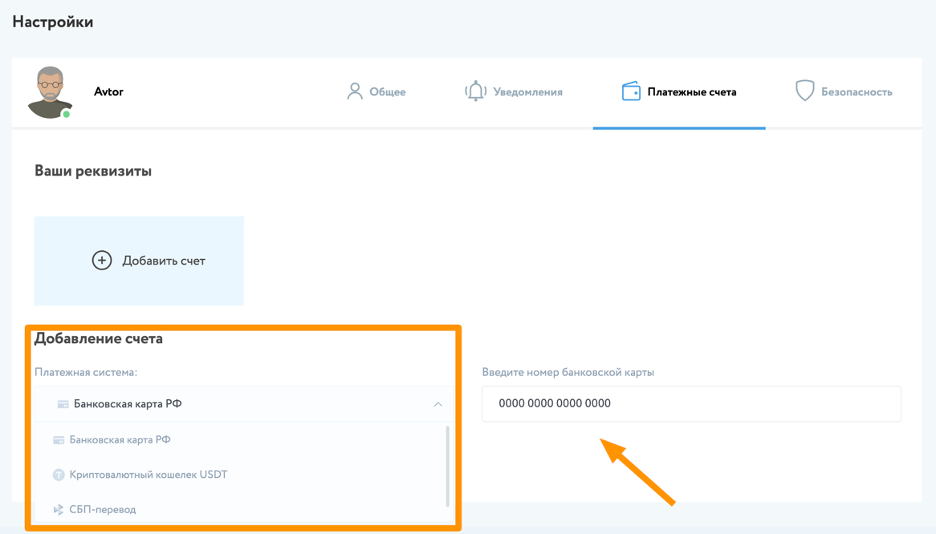 В разделе «Платежные средства» пользователь может добавить реквизиты платежных средств, по которым он планирует осуществлять ввод и вывод денежных средств со своего баланса.