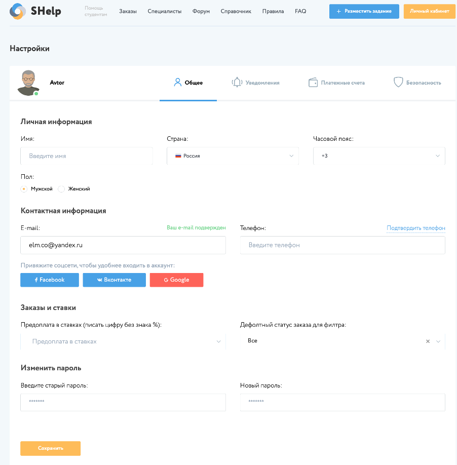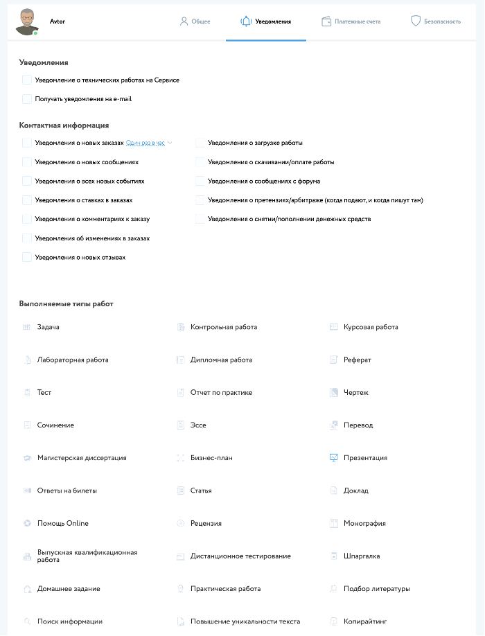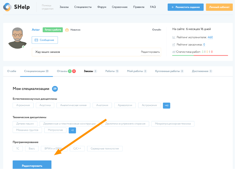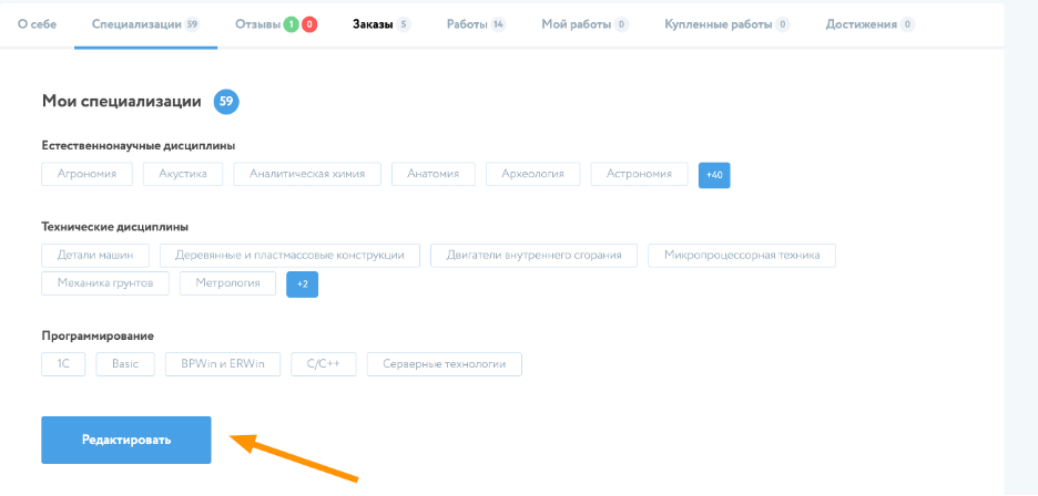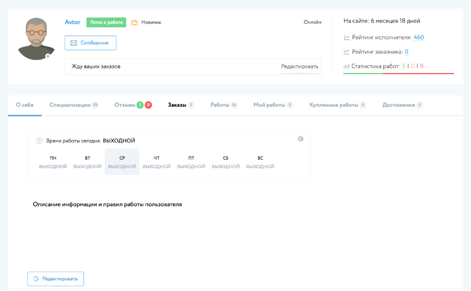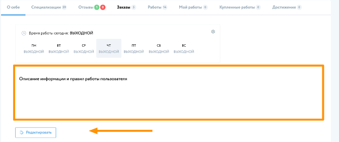 В случае, если пользователь является специалистом, который выполняет заказы в определенной области, то он указывает свою специализацию при редактировании, что позволяет другим пользователям определить его профессиональную область деятельности.
