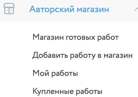 Страница «Авторский магазин» содержит определенное количество уже готовых (ранее выполненных работ) которые находятся на продаже. Пользователи могут приобрести интересующую их работу не ожидаясь определенного срока периода ее выполнения, в случаях когда оригинальная работа не требуется.