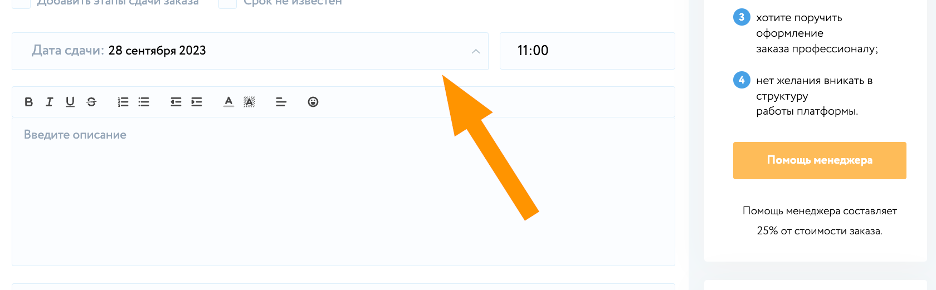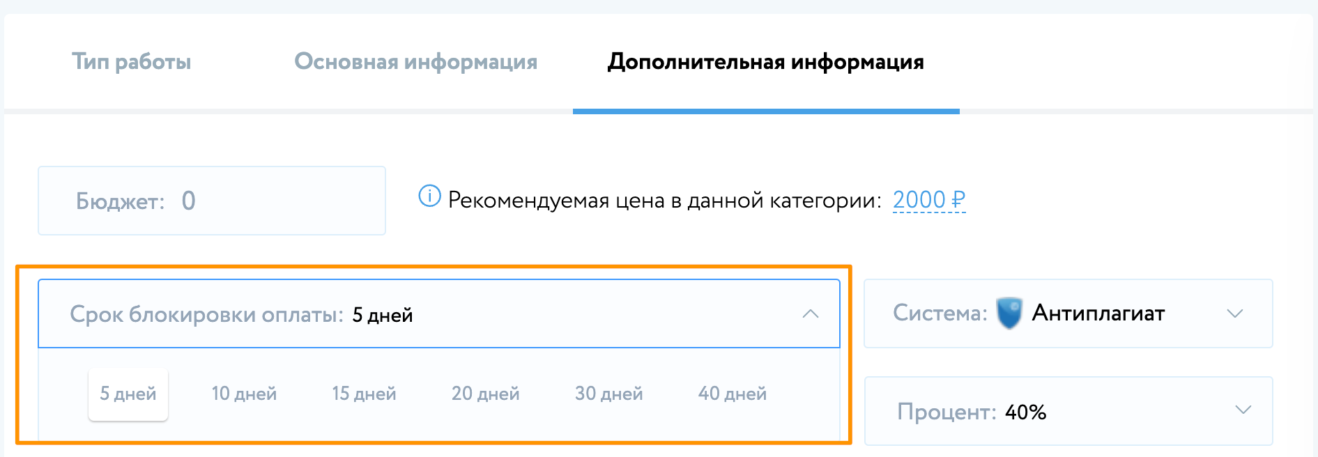 При размещении заказа, новый пользователь, должен указать «Тип работы», «Основную информацию» к заказу и «Дополнительную информацию».