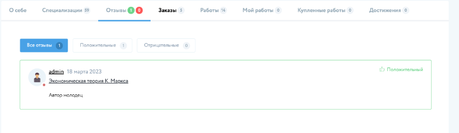Зеленым цветом отмечаются положительные отзывы других пользователей, а красным цветом негативные отзывы других пользователей. Информация об отзывах позволяет определить качество работы специалиста и заказчика на сервисе, а отзыв служит оценкой проделанной работы. Отзывы могут быть оставлены по результатам сотрудничества в заказе.