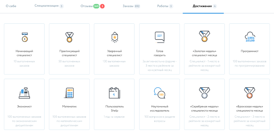 В разделе «Достижения» на странице пользователя можно увидеть награды, которые пользователь приобрел за активную деятельность на сервисе.