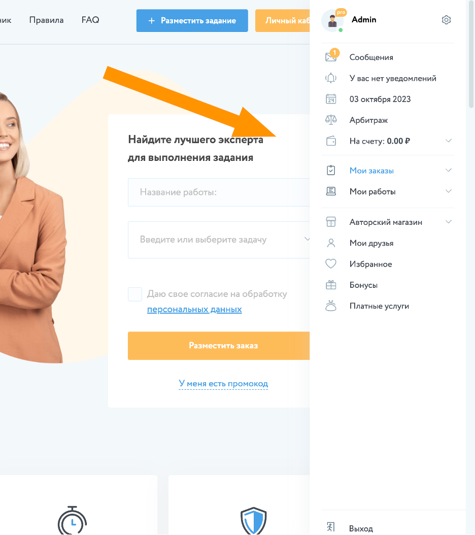 Открывается у тех пользователей, которые совершают заказ (являются заказчиками). При переходи по данной категории открывается страница пользователя, на которой отображается раздел «Заказы», в рамках которого пользователь может ознакомиться с теми заказами, которые он опубликовал на Сервисе.