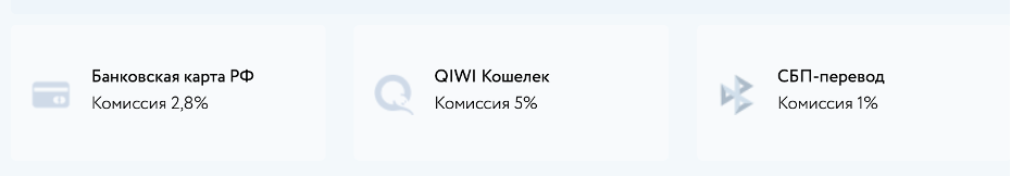 - СБП переводы (комиссия платежной системы составляет 1,5 % + 20 рублей).