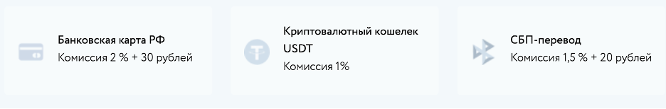 - криптовалютный кошелек USDT (комиссия платежной системы составляет 1 %);